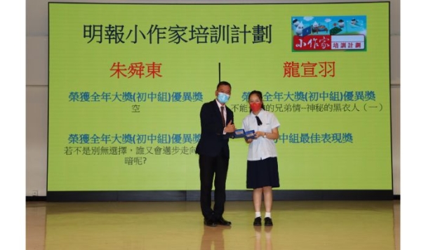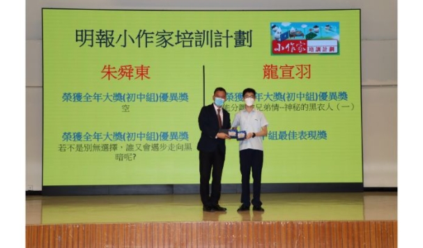 Our students have outstanding performance in the “Ming Pao Writer Training Programme”. 3T Long Suen Yu got the Outstanding Performance Award in the Junior Secondary Group, her work〈不能分離的兄弟情-神秘的黑衣人〉received the Merit Award of the Year (Junior Secondary Group). 3T Chu Shun Tung’s two pieces of work:〈空〉and〈若不是別無選擇,誰又會邁步走向黑暗呢?〉also received the Merit Award of the Year (Junior Secondary Group).