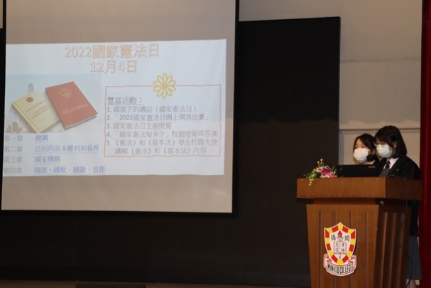 為慶祝「國家憲法日」,公民教育組連同《憲法》和《基本法》學生校園大使舉辦了一系列活動,包括國旗下的講話(國家憲法日)、「2022國家憲法日網上問答比賽」、國家憲法日主題壁報和《憲法》知多少活動,以上活動由學生大使協助推行,更向各位同學推廣及介紹《憲法》與《基本法》的內容。