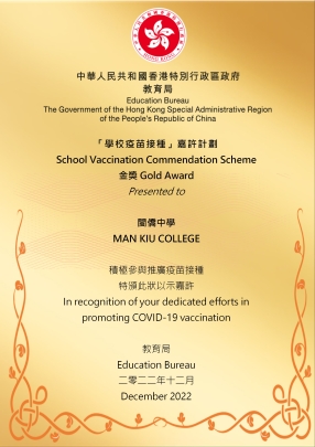 教育局於2022年12月30日公布12月份「學校疫苗接種」嘉許計劃的得獎學校名單。由於本校學生接種三劑2019冠狀病毒病疫苗的接種率已達90%或以上 ,本校獲頒「學校疫苗接種」嘉許計劃金獎。教育局亦特函恭賀本校,與及感謝學校和家長的大力支持。