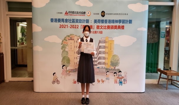 三禮班周卓琳22年12月13日出席美荷樓香港精神學習計劃2021~2022「兩代情」徵文比賽頒獎典禮。大會司儀分享他們收到全香港中小學生5000多份投稿,周同學榮獲全港初中組季軍。於頒獎典禮中,大會安排獲獎同學分享寫作心得,大家獲益匪淺。 另外本校中六禮許森湄及中三禮文䕒莉榮獲優異獎。