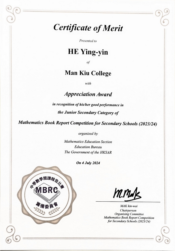 2024年7月4日〈星期四〉,由「教育局課程支援分部數學教育組」主辦2023-24年度中學數學閱讀報告比賽,舉行頒獎典禮,本校3禮班何穎茵從三百多份參賽作品中,脫穎而出,榮獲「表揚獎」,可喜可賀!