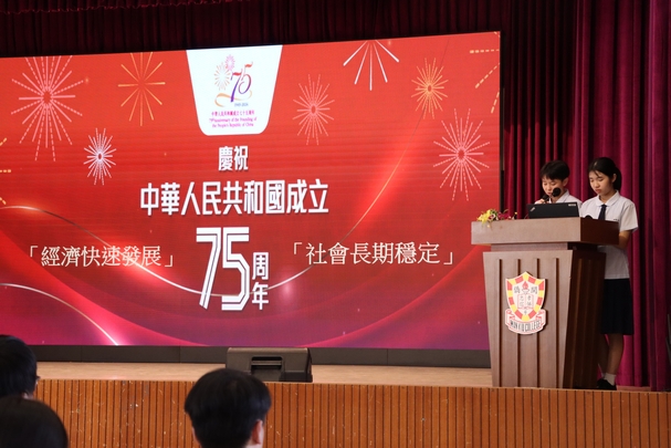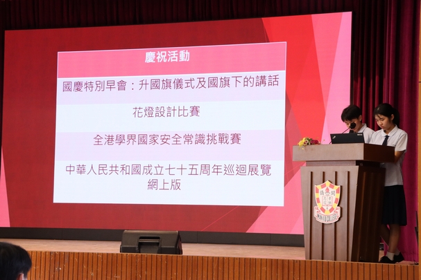 10月1日為國慶日,為慶祝中華人民共和國成立75周年,本校舉辦了一系列慶祝活動。包括國慶特別早會舉行升旗儀式和國旗下的講話、花燈設計比賽、參加全港學界國家安全常識挑戰賽,以了解祖國發展,加強學生國民身份認同。
