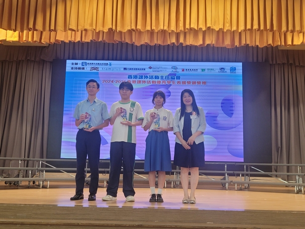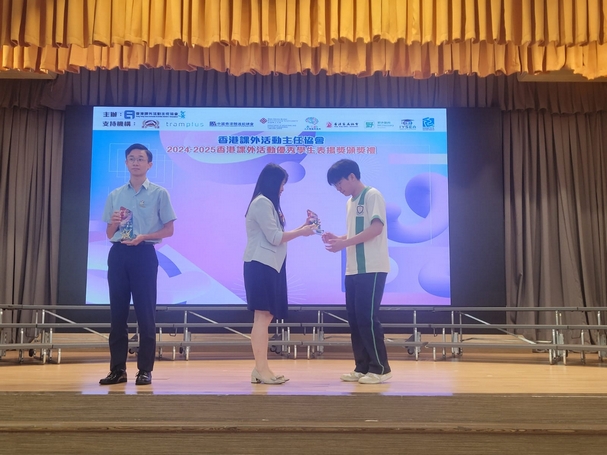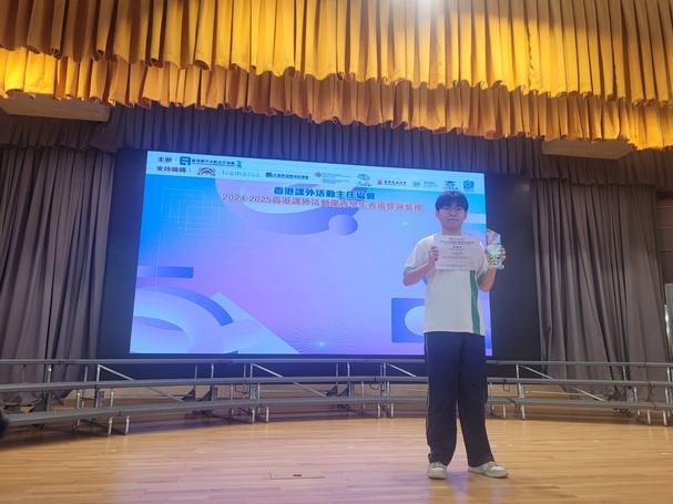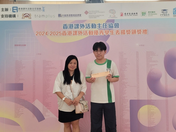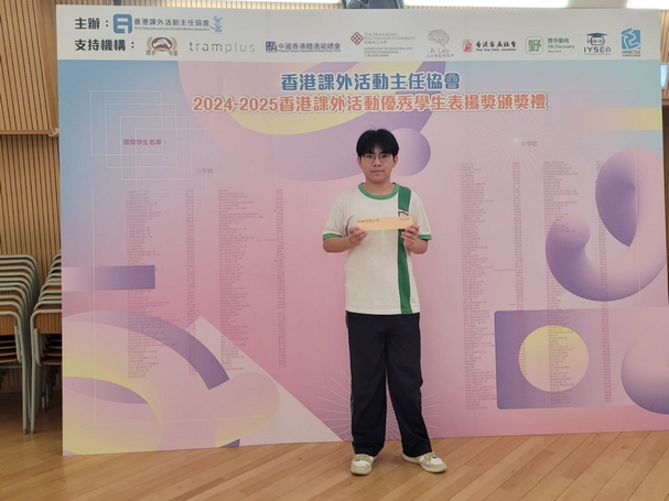 恭喜本校6禮班吳溢釗同學榮獲2024香港課外活動優秀學生表揚獎,此獎是表揚及肯定對課外活動方面有傑出表現的同學。吳溢釗同學於2025年5月12日參與2024香港課外活動優秀學生表揚獎頒獎禮,並獲頒發獎座及證書。