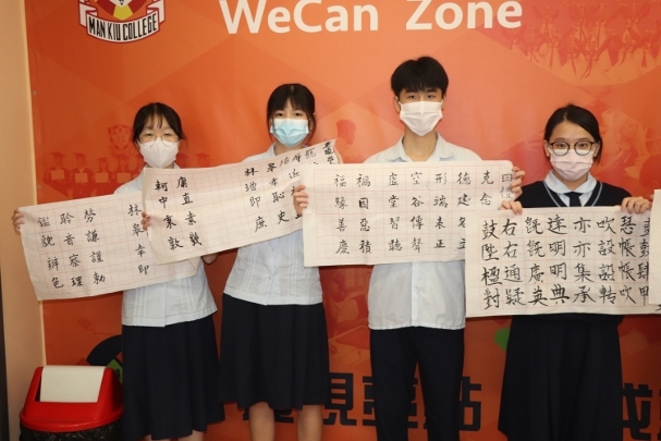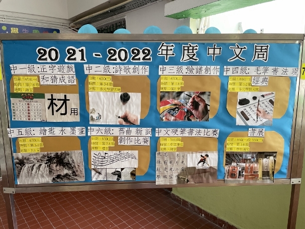 今年中文周於10月4日至8日舉行,中文科、普通話科和中文學會安排了不同與「中華文化」相關的活動,旨在讓各級同學體驗不同的中華文化,提高學習中國語文的興趣。活動包括中一級電子學習遊戲(正字和成語)、中二級新詩創作遊戲、中三級臉譜繪畫創作、中四級毛筆書法現經典、中五級國畫意趣齊齊學、中六級舊曲新詞創作比賽,另有中文硬筆書法比賽和書展,讓同學一起享受豐富多姿的中文周活動。