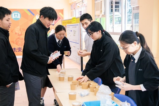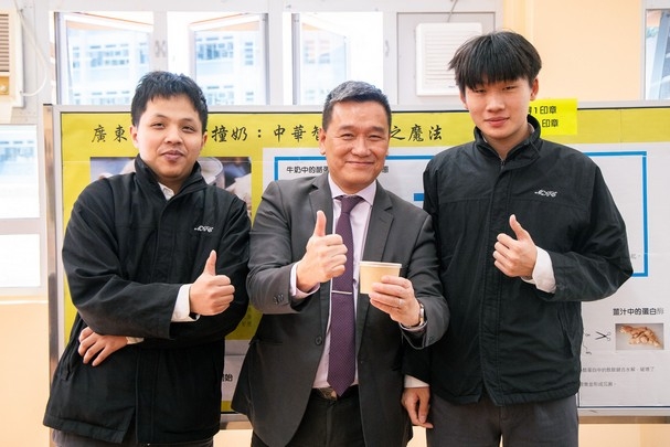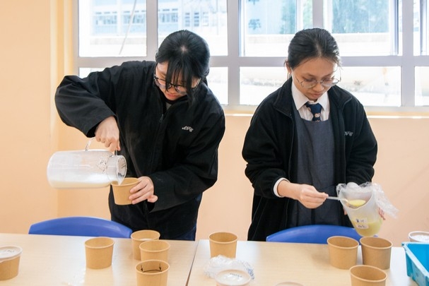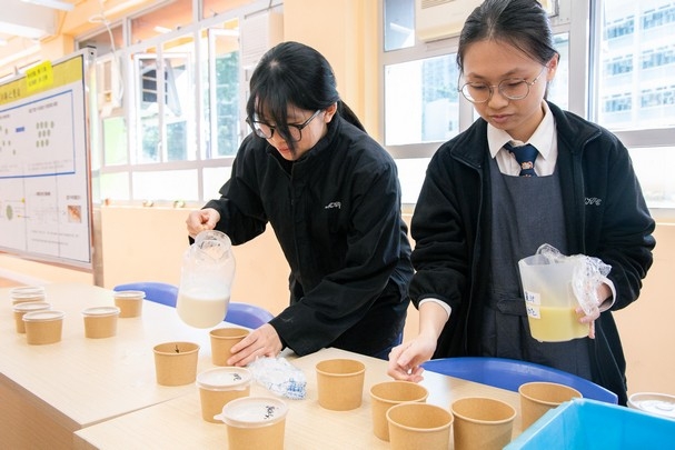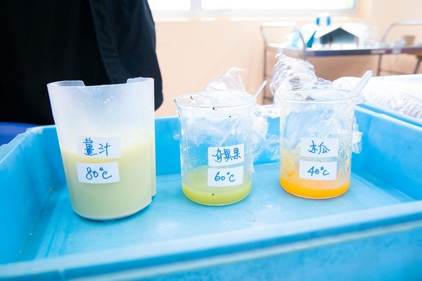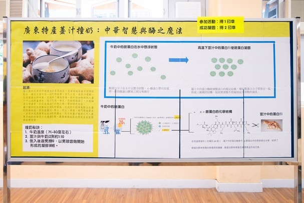 學生運用生物與化學知識,了解薑汁撞奶的原理,親手製作並嘗試用奇異果、木瓜等含蛋白酶水果,成功完成撞奶。體會中華傳統美食的美味與暖胃,也感佩前人智慧,過程中充滿學以致用的樂趣。