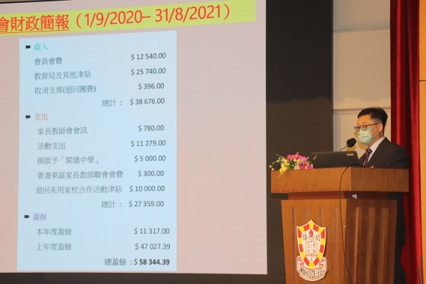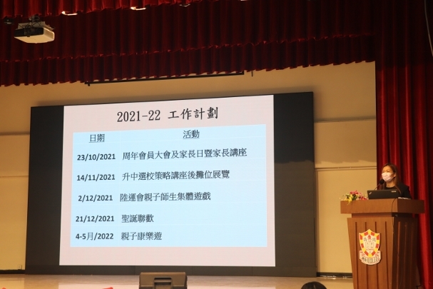 本校家長教師會第26屆會員大會已於10月23日順利完成。主席陳婉兒女士先作會務報告,回顧了上一屆家教會的活動及簡介未來一年的計劃。接著,由張啟賢助理校長作出財政報告。繼而,林政寧校長頒發委任證書及感謝狀予各家長和教師執委,以作表揚。另外,家長教師會捐贈支票予校方,供學校發展和改善設施之用。