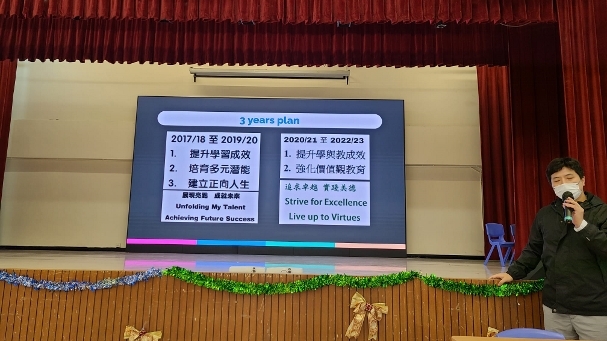 為讓學校持續發展,全校老師不斷自我完善,於12月28日學校假期間回校參與自評工作坊,並在工作坊中就以下四個範疇進行分組討論,包括「管理與組織」、「專業領導」、「學與教」、「學生表現」。透過自我評估,制定學校發展方向,貫徹「策劃 – 推行 – 評估」這自評循環的理念。