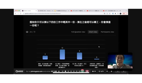 本校駐校社工張文康先生、吳少芝姑娘於2022年3月29日〈星期二〉為中五級同學進行了網上成長課,主題是「疫情下的多元出路」。 社工先以問卷調查作為熱身活動,讓同學反思「工作」的條件;接著與同學分析他們應如何自我增值去面對職場的轉變。 以下是當天的照片,歡迎各位家長、老師、同學或親友觀賞!