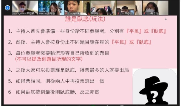 北角樂Teen會社工劉昭瑩姑娘、周學謙先生於2022年3月29日(星期二)、4月7日(星期四)、4月12日(星期二)為新來港學生安排了3場zoom小組活動。社工透過網上進行集體遊戲,如「誰是臥底」、「海龜湯」、「狼人殺」等,以及學生間分享個人愛好和假期趣聞,從而建立新來港學生的互助網絡,支援學生疫情下的社交需要,提升學生聽說廣東話的機會及自信。以下是活動照片,歡迎各位家長、老師、同學或親友觀賞!