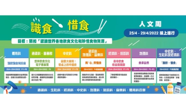 在25/4/2022-29/4/2022通識科、生社科、經濟科、中史科、地理科、旅款科、音樂科、體育科和圖書館舉辦了一連串的線上活動,主題為「識食、惜食」。