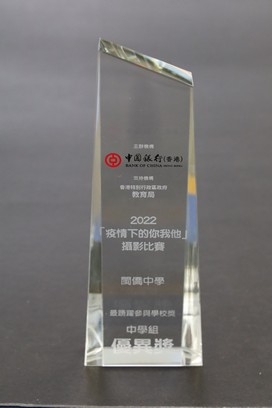 由中國銀行(香港)主辦「疫情下的你我他」攝影比賽,本校榮獲「最踴躍參與學校獎」中學組優異獎。 在2022年10月28日〈星期五〉,校長在早會嘉許同學的積極參與。